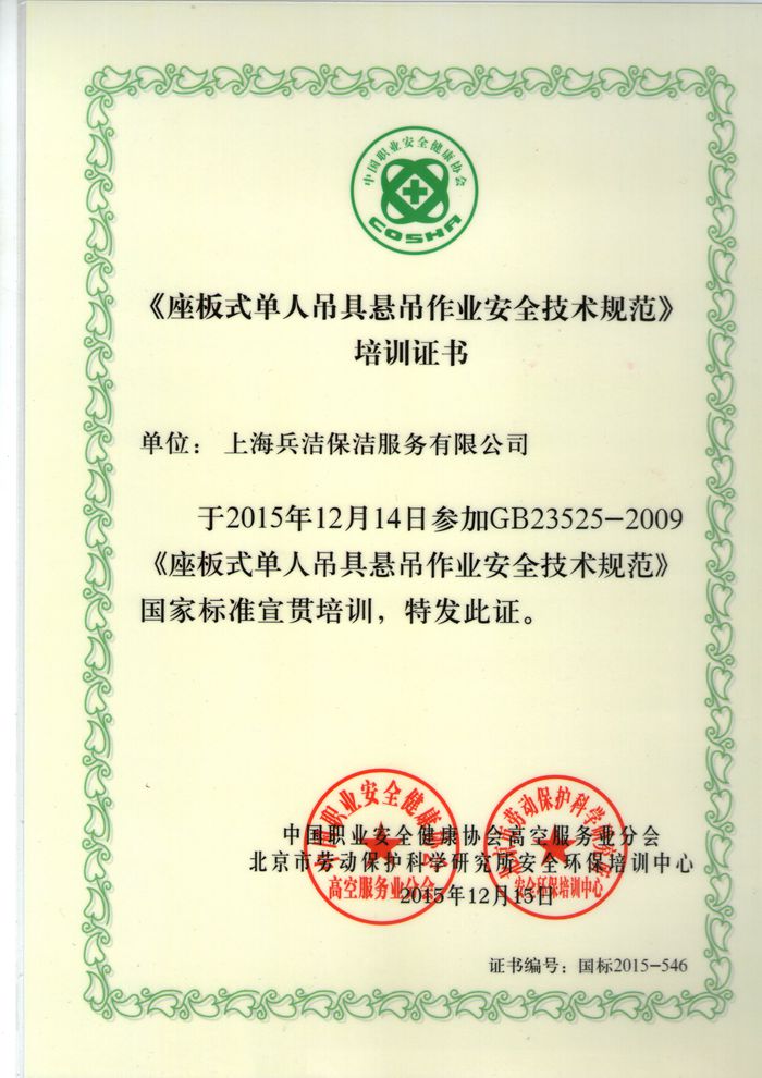 • 懸吊作業安全技術國家標準宣貫培訓證書